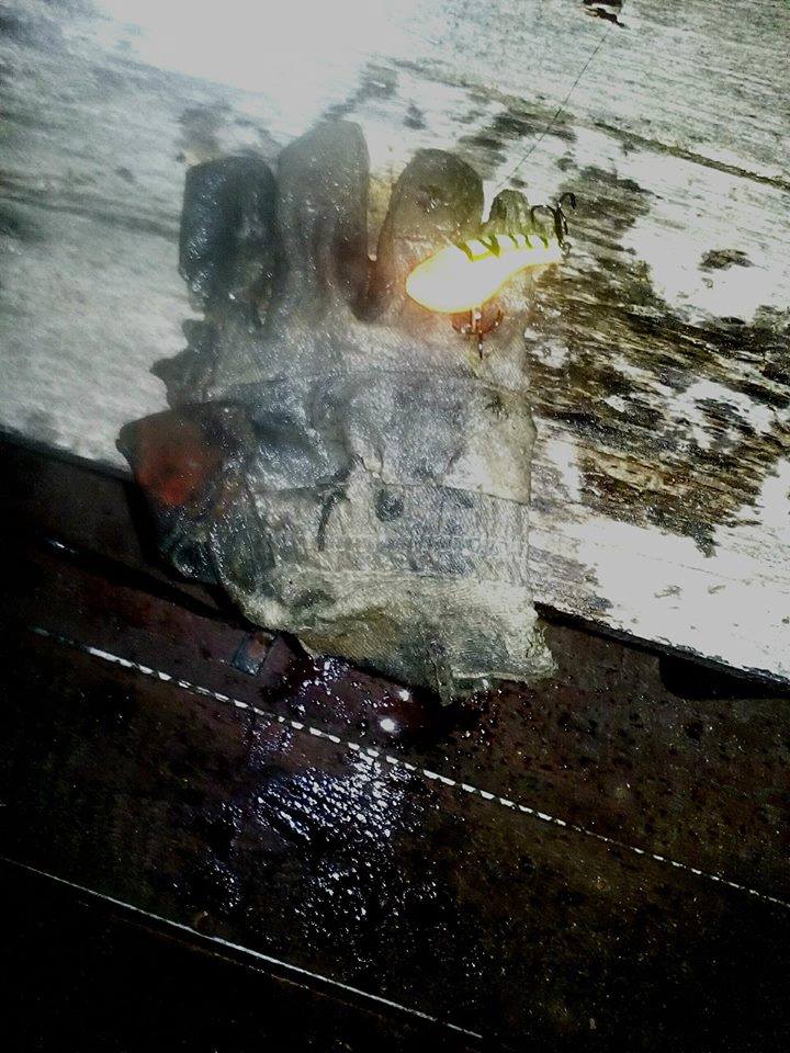 Következő akasztásom elég furán húzott a víz alatt, gondoltam biztos valami rehabos harcsa, de csak egy ötujjas, bőr munkavédelmi kesztyű volt. Természetesen ebbe olyan jól akadt a horog, hogy hosszabb időbe tellett, míg a bicskámmal sikerült kivágnom belőle. Már nem éreztem olyan jól magam, a derekam is elkezdett fájni. Ahogy itt ficeregtem a mólón, aminek az állapotát csak a recsegéséből sejtettetem, egyszer csak reccs, és egyik lábam alatt eltört egy deszka, nagyon megijedtem, egyik lábam lent a vízben, a másik lábam rá merőlegesen fent a mólón. Beszorultam rendesen, a golyóimon ültem, a” pöttyös” nem sérült, de a combom eléggé. Olyan korlát gyakorlat félét csináltam, mint a saslengés, és kitornásztam magam a vízből. Zoknim bakancsom átázott, de nem adtam fel.