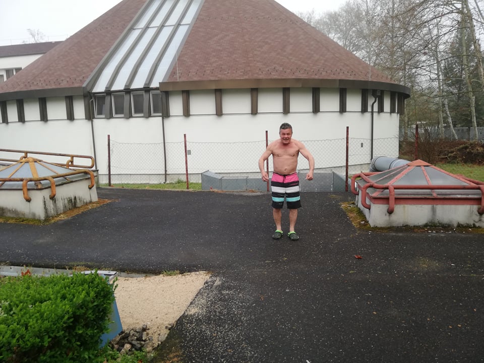 Bőröndjeim kipakolása után, a kedves, mosolygós doktornőm megvizsgált, és kiírta 21 napra a különféle kezeléseket. Ezen a napon csak egy meleg vizes fürdésre kellett mennem. Délután felhúztam a pampalini térdig érő csíkos fürdő gatyám, és megkezdődött a bolyongásom, a medence keresése. Ez számomra elég nagy feladat, mert akár Kisfoktőn is képes vagyok eltévedni. Mentem a mások számára teljesen egyértelműen felfestett útmutatú jelzések után, de többszörösen visszaértem a kiindulási pontomhoz. Úgy jó fél óra elteltével, több embert megkérdezve eljutottam a medencéhez. Félelmeim szertefoszlottak mikor a medence melletti táblán elolvastam vízmélység 1.3 méter. Megnyugodtam: leér a lábam. Ugyanis 54 éves pecás létemre szégyen ide, szégyen oda nem tudok úszni. Eléggé fáradt voltam, és egy kicsit távolabb a többi fürdőzötől, idegen szóval élve, hogy jelenlegi tanulmányaim is gyakoroljam introvertált módon, szememet becsukva üldögéltem a medence szélén. Jól éreztem magam a meleg vízben, félig csukott szemem sarkából láttam, hogy egy úgy hetvenes nénike figyel, és észrevettem hogy araszolgat felém. Becsuktam szemem, hogy jelezzem nem igazán vágyok társaságra. Mikor pár perc múlva kinyitottam már ott volt mellettem, kedvesen mosolygott, és kérdezte: